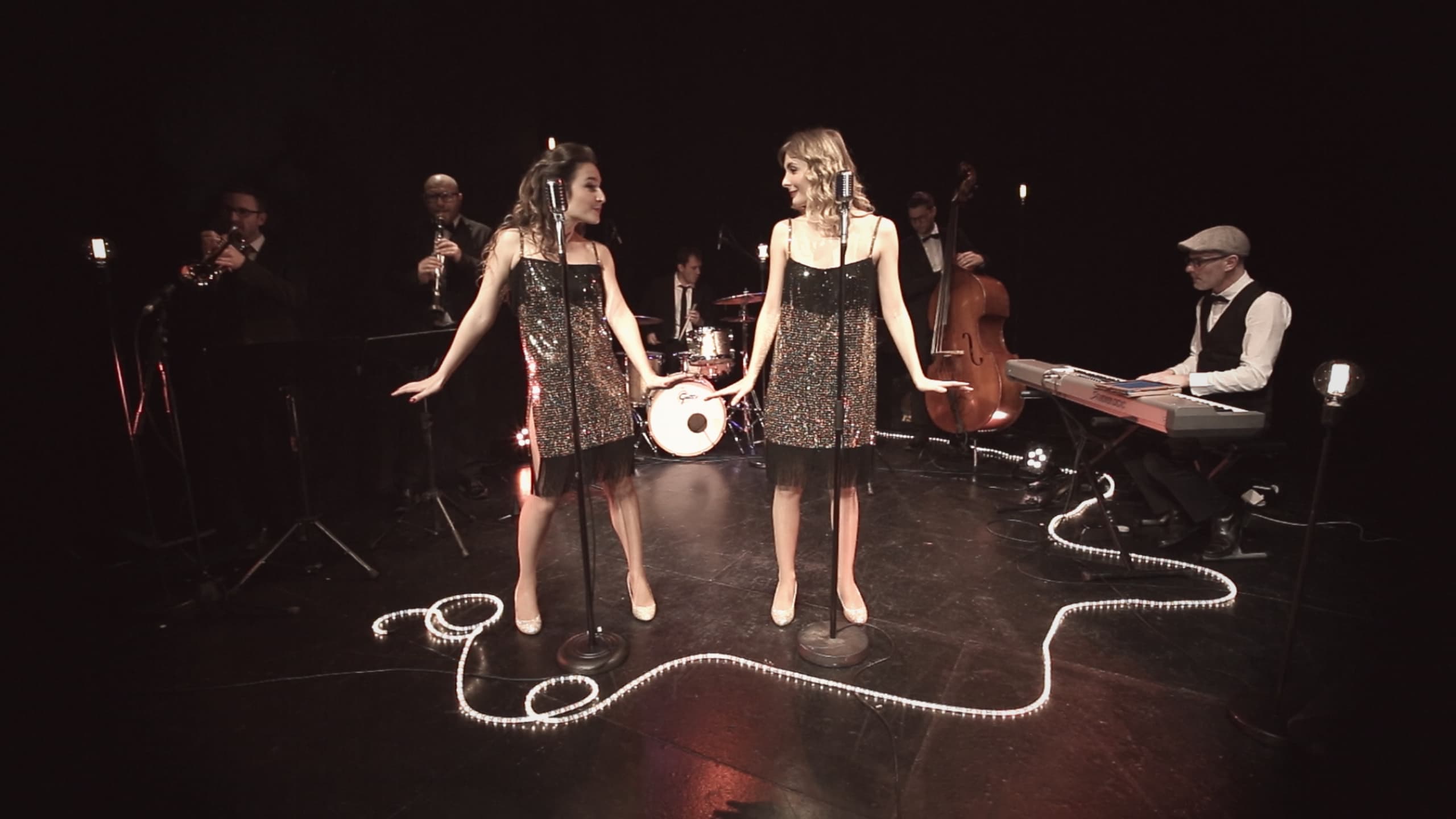 Dans un style Jazz, Swing, Charleston, on redécouvre la folie des Andrews Sisters, le charme de Marylin Monroe et la classe de Frank Sinatra. Accompagnées d’un band de six musiciens , leurs deux voix s’entremêlent et se démêlent pour former un cocktail de bonne humeur !